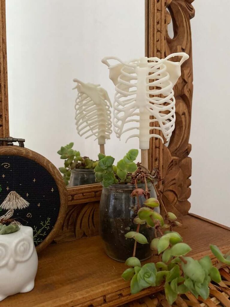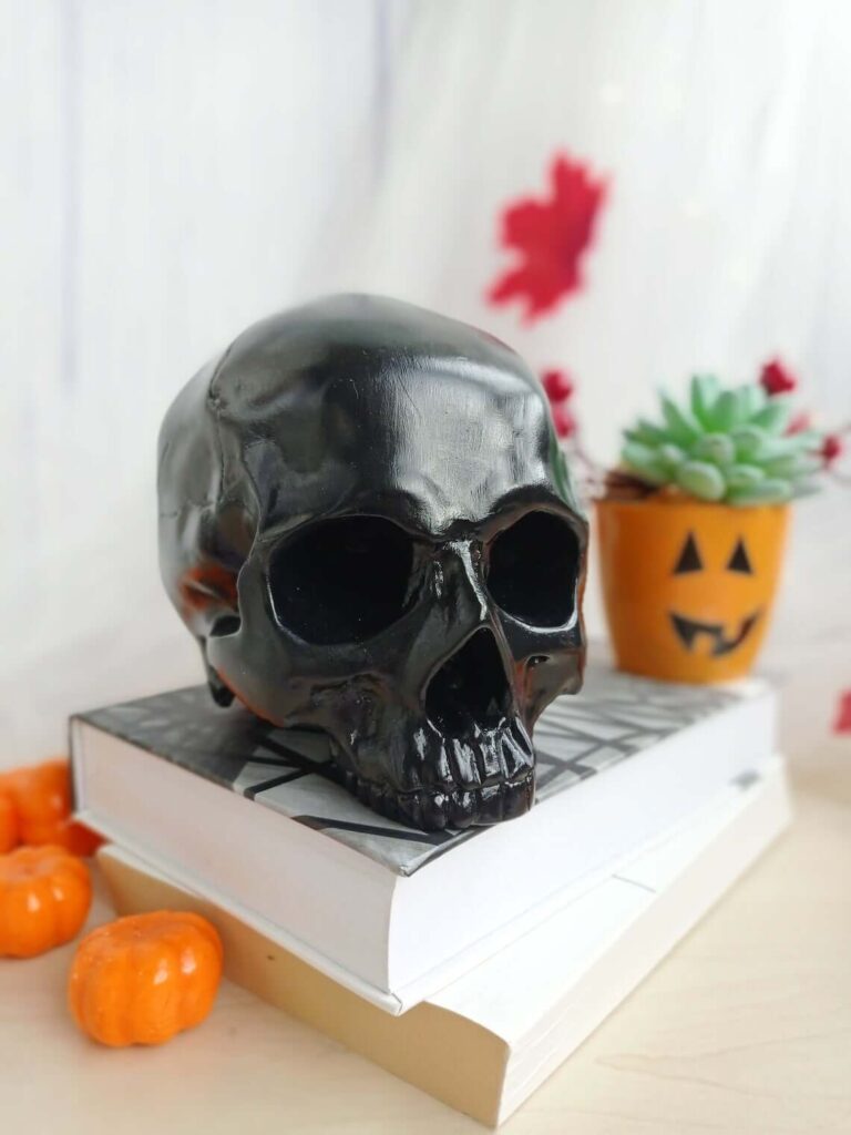 Aside from pumpkins, skulls and skeletons have to be one of the most Halloween-themed decor! They are so cool to place in bookshelves, entryway tables, bar carts, and centrepieces! You could either just do black or white skulls or do full skeletons! The picture below has a dog skeleton which looks fab!