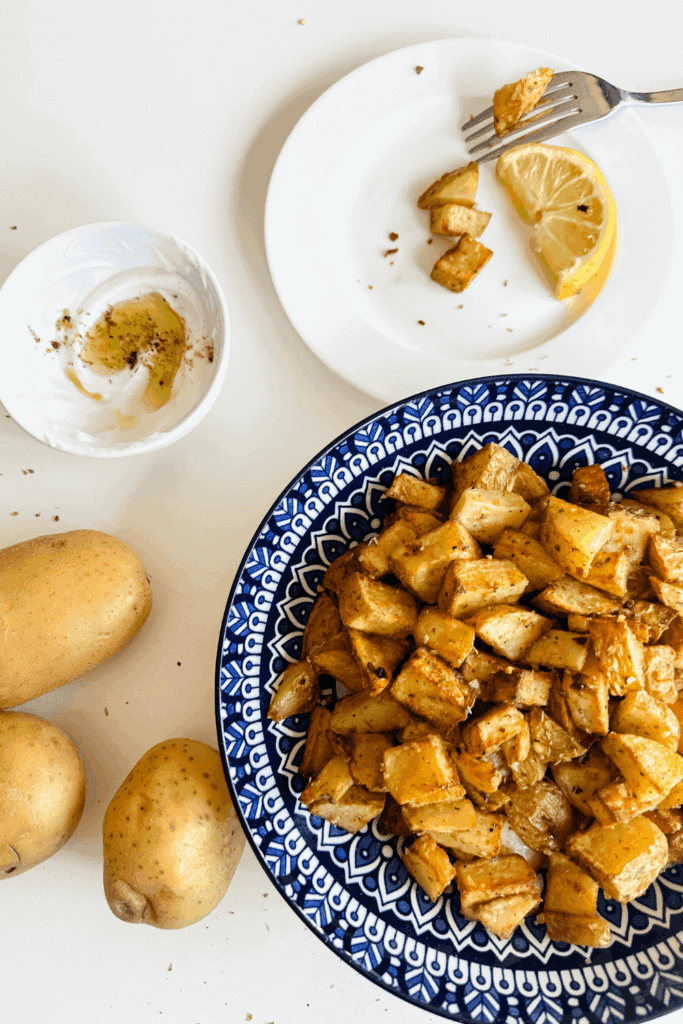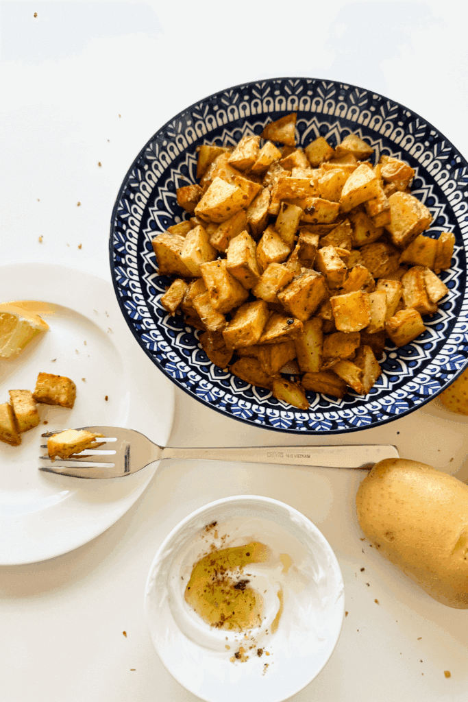 - Once potatoes are cooked and crispy, add them back in a bowl, add the last Tbsp of olive oil, Greek seasoning and freshly squeezed lemon juice and toss!