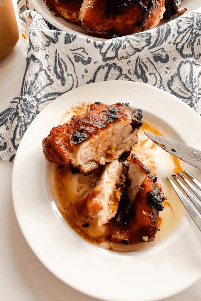 I make my miso butter chicken in my air fryer however, you can also cook these chicken thighs in the oven or even on the stove top! Aside from the air fryer, you’ll need either a cutting board and knife to mince up the garlic or you can just use a garlic press like I do! Then of course some bowls to marinate the chicken in and mix the sauce up.