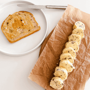 This butter is great to use on so many things, so it may not last too long but so far, I’ve added it on toast and pancakes and I’m absolutely obsessed!! Flavoured butter can typically be kept in the fridge for about 1-2 weeks when stored in an airtight container or tightly wrapped in plastic wrap or parchment paper. You can also freeze this for about 3-6 months! Just make sure it’s well wrapped and sealed in a freezer-safe bag to avoid any freezer burn taste. To use from the freezer, just slice off what you need or let it soften in the fridge overnight.