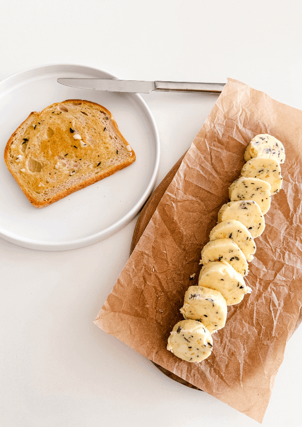 IF this even lasts haha, flavoured butter can typically be kept in the fridge for about 1-2 weeks when stored in an airtight container or tightly wrapped in plastic wrap or parchment paper. You can also freeze this for about 3-6 months! Just make sure it’s well wrapped and sealed in a freezer-safe bag to avoid any freezer burn taste. To use from the freezer, just slice off what you need or let it soften in the fridge overnight.