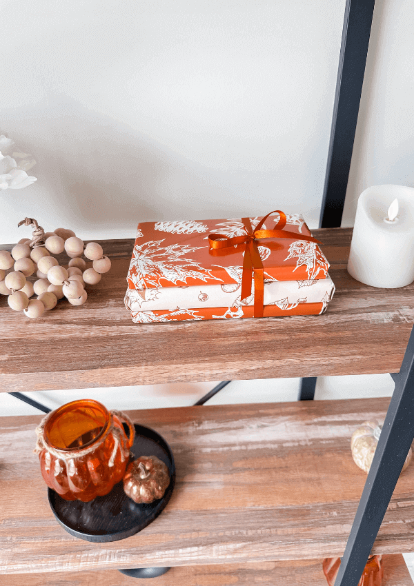 I bought everything I needed on Amazon! I did make this pretty early so Fall decor hasn’t rolled in yet, but you can definitely purchase everything at Michaels. I chose some fall wrapping paper on Amazon, and there are so many to choose from! I chose orange and white! I felt like it went nicely on my shelf, but choose whatever you like! Aside from this, you’ll just need some fall-patterned ribbon or even a solid colour one like orange, yellow, brown, black or white and of course, some tape!