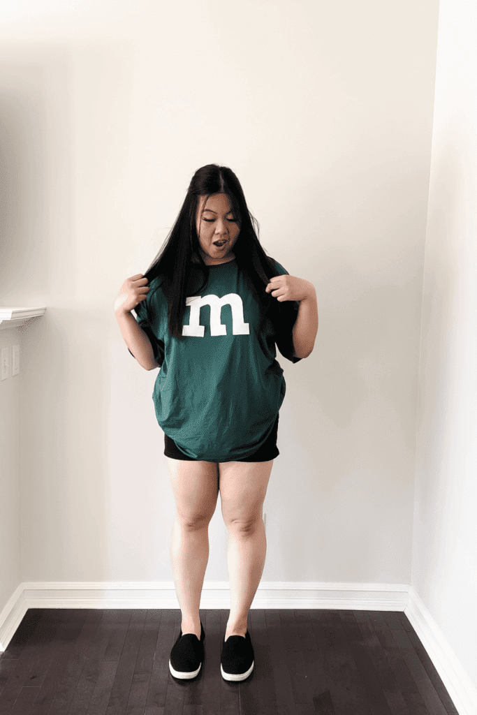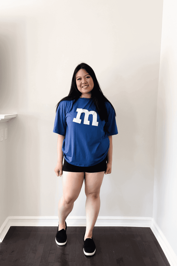 This costume is so great to create as you can easily be any colour of M&M and you may already have a shirt that you can easily use for this! If you don’t have an M&M coloured shirt, you can also just purchase shirts from online retailers like Amazon or at a craft or dollar store!