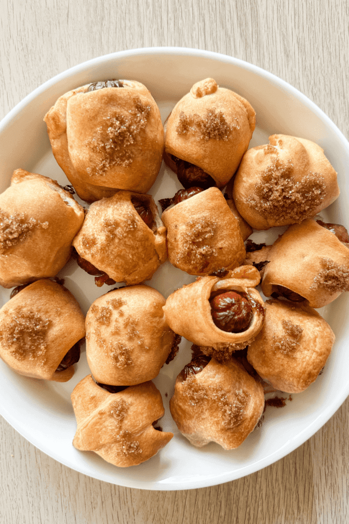 I’m sure at one point we’ve all had a different variation of pigs in a blanket. It’s essentially a sausage or a hot dog inside a pastry or bread! I made these sweet and savoury bacon pigs in a blanket with brown sugar that are so addicting! They’ll be gone before you even set them on the table.