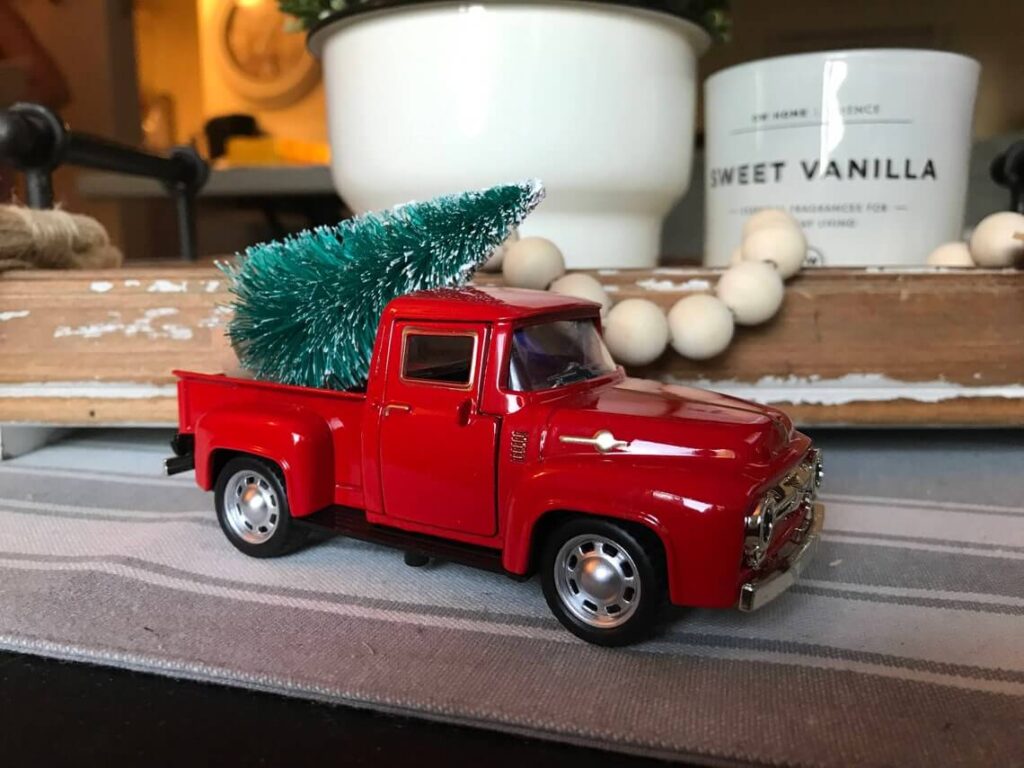 I tried to find out the origin of this red truck with a Christmas tree in the back but I haven’t yet but it’s totally everywhere on Christmas and is definitely an official symbol of the holidays! I love this setup as it reminds me of a red plaid farmhouse style and is super cute for more casual dinner parties!