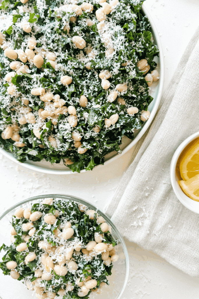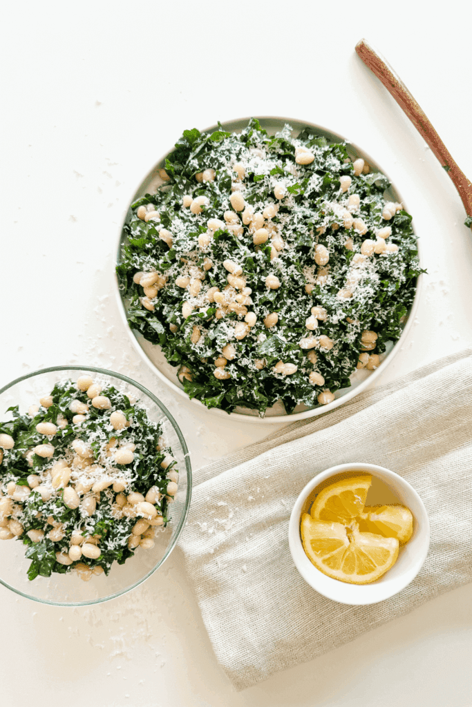 This salad is so easy so you may already have already at home but for the most part, you will just need to purchase some fresh kale and white beans. Fresh kale is available at most grocery stores all year round in the produce aisle and canned beans as well but in the pantry section. Those two ingredients are the star of the show then you’ll also want some lemon, salt, pepper, olive oil and grated parmesan! All available at local grocery stores.